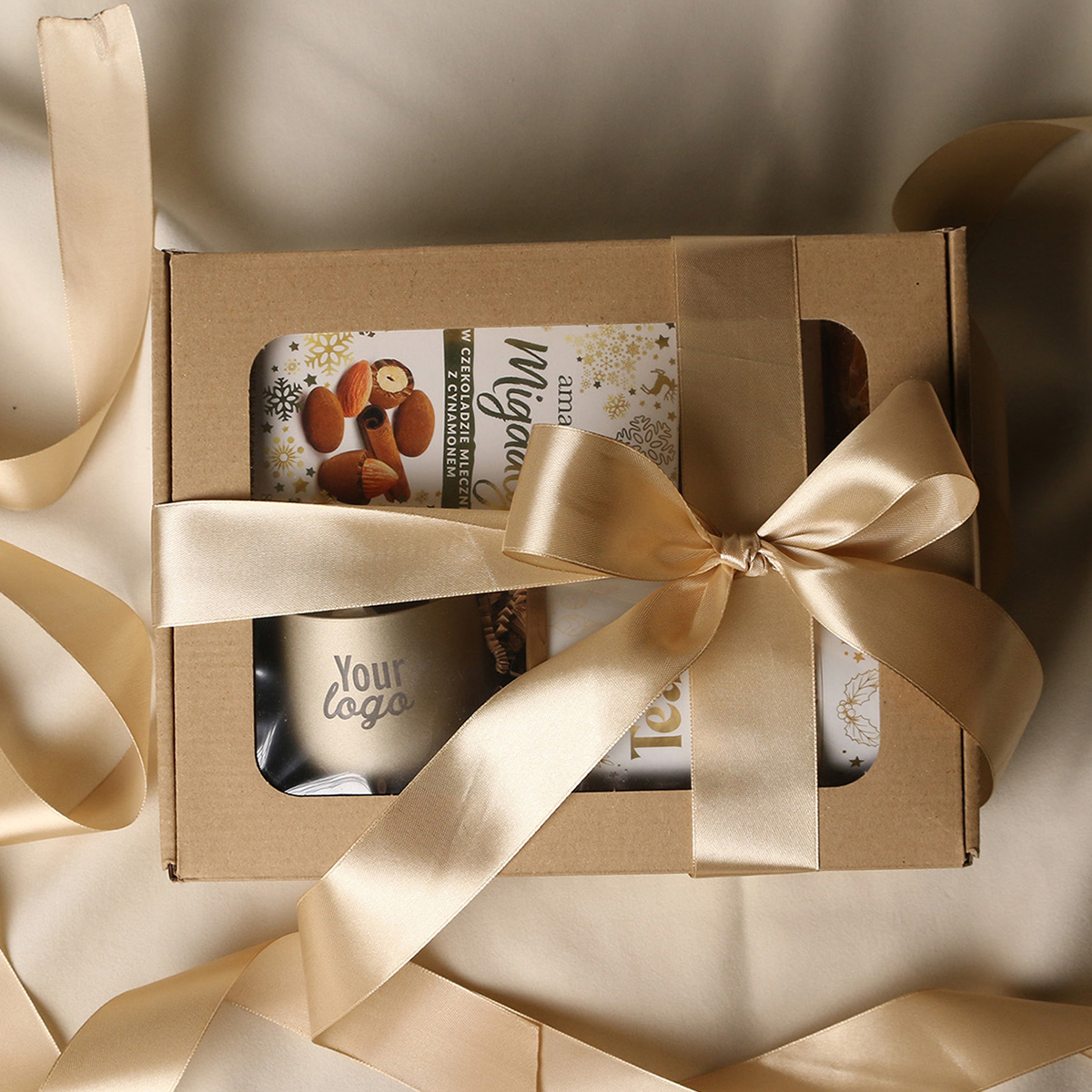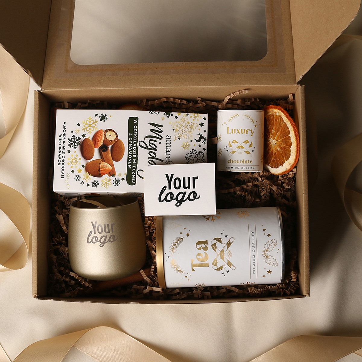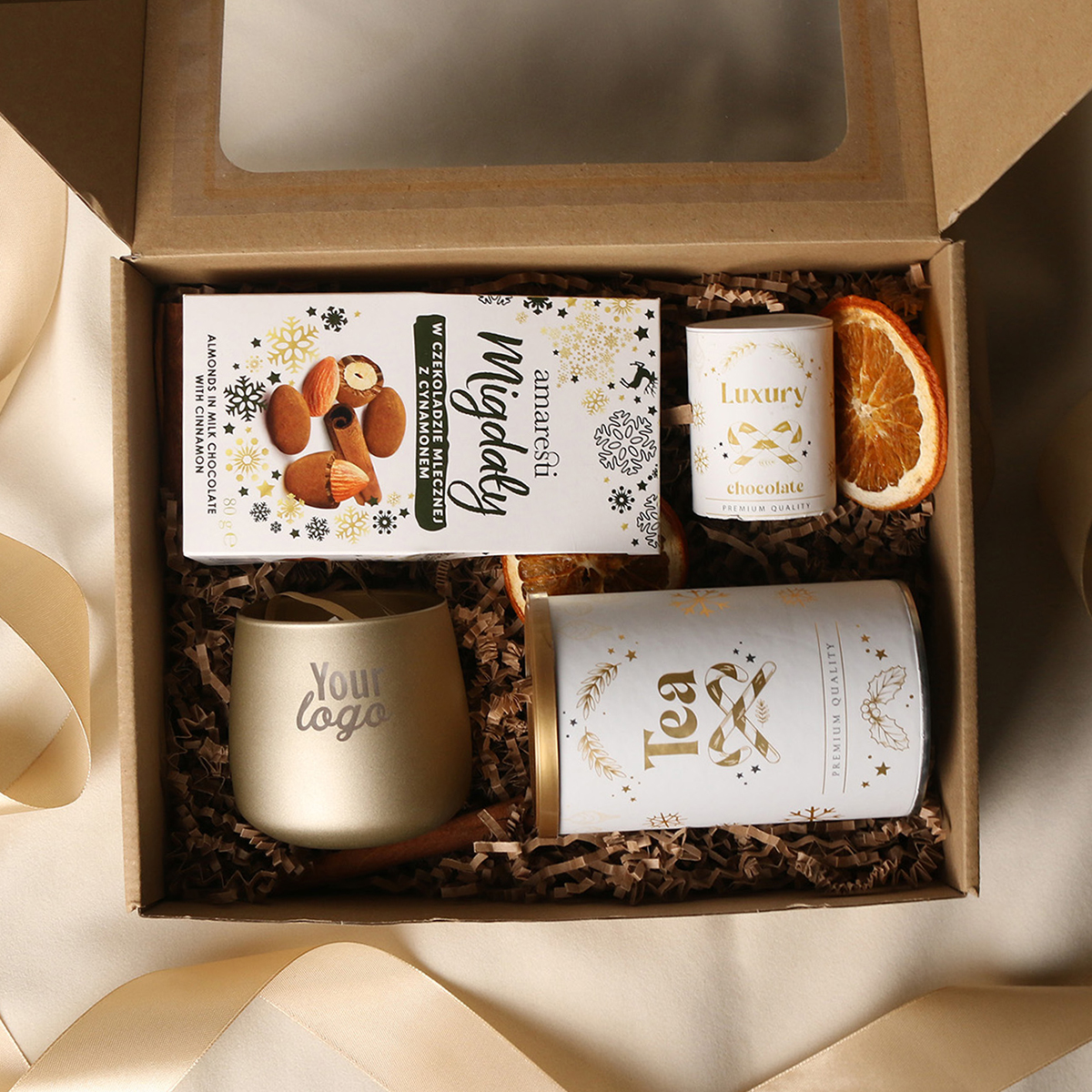 W skład zestawu wchodzą: Lampion Sensitive złoty mat (z t-light'em sojowym) z możliwością zdobienia, Amaresti Pralines- migdały w czekoladzie z cynamonem, zielona herbata Sencha z wiśniami, płatkami róży zapakowana w tubę z motywem zimowym, Luxury Chocolate - Czekolada Belgijska do picia w tubie z motywem zimowym. Całość w stylowym opakowaniu z tektury eco z okienkiem. Opcje dodatkowej customizacji: nadruk na lampionie, bilecik z logo firmy, wstążka lub obwoluta z motywem zimowym wzbogacona złoceniem.